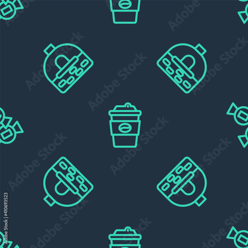 Set line Coffee cup to go, Brick stove and Candy on seamless pattern. Vector.