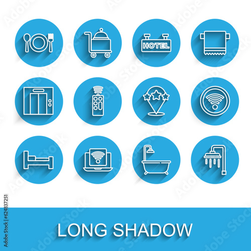 Set line Hotel room bed, Wireless laptop, Plate, fork and knife, Bathtub with shower, Shower, Remote control, Wi-Fi wireless and Five stars rating review icon. Vector