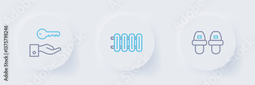 Set line Hotel slippers, Heating radiator and door lock key icon. Vector