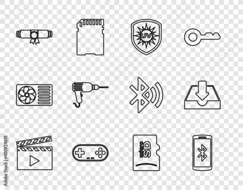 Set line Movie clapper, Smartphone with, UV protection, Gamepad, Diploma rolled scroll, Drill machine, Micro SD memory card and Download inbox icon. Vector