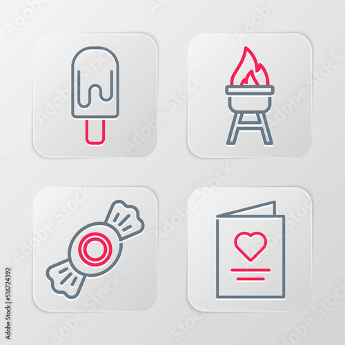 Set line Postcard with heart, Candy, Barbecue grill and Ice cream icon. Vector