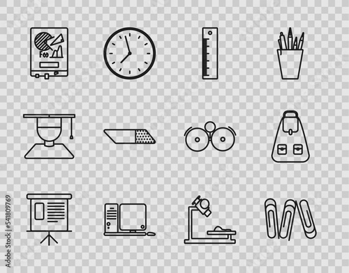 Set line Presentation financial board with graph, infographic, pie graph, Paper clip, Ruler, Computer monitor keyboard and mouse, Board, Eraser rubber, Microscope and School backpack icon. Vector