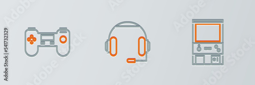 Set line Retro arcade game machine, Gamepad and Headphones icon. Vector