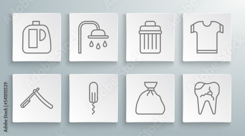 Set line Straight razor, Shower head, Sanitary tampon, Garbage bag, Broken tooth, Trash can, T-shirt and Bottles for cleaning agent icon. Vector