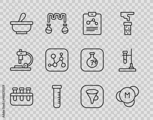 Set line Test tube and flask, Molecule, Chemistry report, Mortar pestle, Chemical formula, Funnel filter and on fire icon. Vector