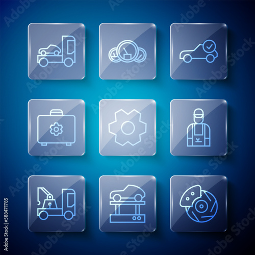 Set line Tow truck, Repair car on a lift, Car brake disk with caliper, Auto service check automotive, Gear, Toolbox, transporter and mechanic icon. Vector