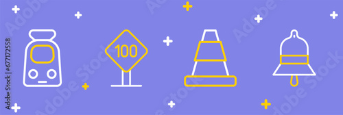Set line Train station bell, Traffic cone, Speed limit traffic sign 100 km and and railway icon. Vector