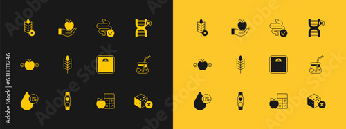 Set No GMO, Smart watch with heart, Bathroom scales, Calorie calculator, Wheat, Intestines, Gluten free grain and Apple icon. Vector