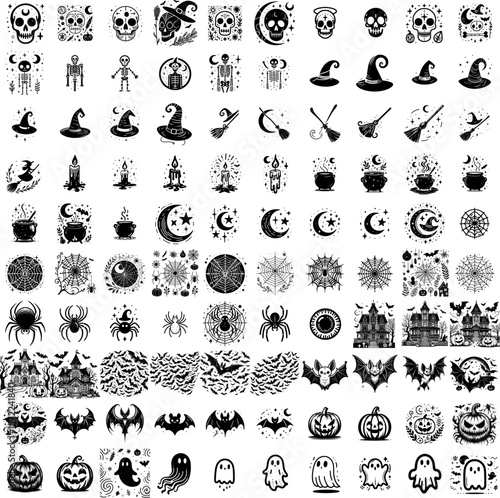 halloween, doodle, skittish, ghost, pumpkin, skull, skeleton, sorcerer, broomstick, bat, cauldron, spider, moon, star, web, haunted, candle, children, cute, black, white, minimal, party, trick, treat, eyeball, bat, sorcerer, illustration, cat, evil, animal, silhouette, horror, collection, 100, design, isolated, monster, holiday, signs, vector, element, celebration, decoration, set, symbol, scarey, icon
