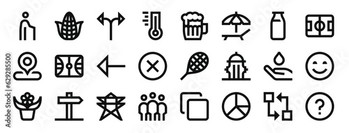 miscellaneous, icon, vector, set, elderly, corn, outline, cleaving, thermometer, beer, symbol, sunbed, milk, soccer field, web, linear, pin, basketball court, signs, thin, pack, flat, cancel, racket, illustration, line, hydrant, happy, flower, panel, group, copy, pie chart, workflow, question, stroke, concept, graphic
