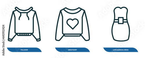 set of 3 linear icons from clothes concept. outline icons such as pullover, sweatshirt, long bandeau dress vector