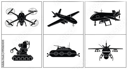 military, vehicle, icon, vector, drone, aeroplane, helicopter, tank, robot, transport, warfare, army, illustration, set, black, white, graphic, resource