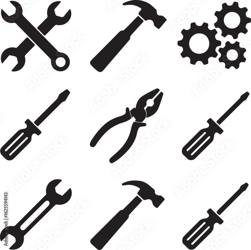 tool, hand tool, wrench, hammer, screwdriver, plier, gear, construction, repair, maintenance, engineering, bricolage, graphic, silhouette, black-and-white, hardware, equipment, mechanical, manual, industry, service, fixing, building, manufacturing, design, instrument