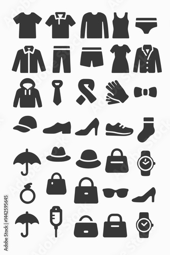Set of black clothing and fashion accessory icons including t-shirt, polo, sweater, tank top, underwear, pants, shorts, dress, jacket, hoodie, tie, scarf, gloves, bow tie, cap, shoes, high heels, snea