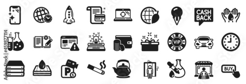 Set of Business icons, such as Chemistry experiment, Internet warning, Car icons. Clock, Chemistry flask, Present box signs. Ice cream, Parking security, Teapot. Smoking, Servers, Rocket. Vector