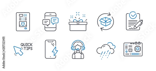 Set of Business icons, such as Support, Phone messages, Return parcel, Smartphone charging, Quick tips, Rfp, Coffee vending, Rainy weather, Present box, Motherboard line icons. Vector