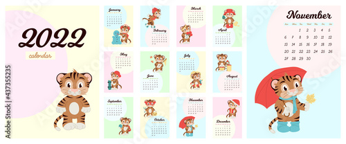 Set of calendar for 2022 year of the tiger. Set of 12 pages and cover with cute tiger in flat design. Week starts on Sunday. Planner, stationery, wall calendar, diary, desk, screen.