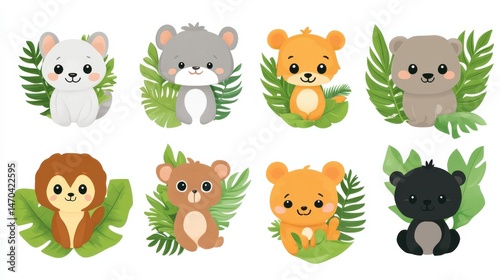 jungle, animal, cartoon, cute, illustration, wildlife, set, group, collection, tropical, exotic, fun, happy, smiling, tree, leaf, adventure, explorer, monkey, elephant, lion, tiger, giraffe, zebra, parrot, snake, rabbit, fox, bear, gorilla, toucan, chameleon, hippo, crocodile, rhino, koala, sloth, owl, lizzard, jaguar, cheetah, duck pond, waterfall, vine, plant, foliage, fern, bamboo, bright