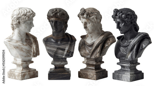 Set of classical marble bust sculptures, various shades and textures, detailed drapery and hair in greco roman style, transparent background png.