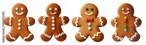set of collection happy Christmas cookie gingerbread man isolated png transparent background smiley face bow tie and hat cap icon holiday sweet treat shape with white, red icing biscuit fun joy family