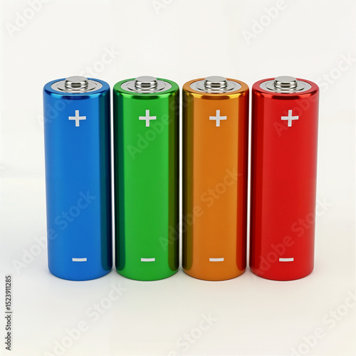 Set of Colorful AA Batteries Standing Upright on White Background