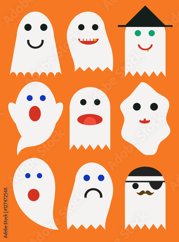 Set of cute cartoon Halloween Ghosts, Halloween night, Ghost silhouette for your design isolated on background. Ghosts emoticon halloween set..