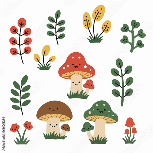 mushroom, plant, fungal, fungal, toadstool, flora, foliage, leaf, leaf, tree branch, stem, flower, grass, botanical, nature, forest, timberland, cute, character, cartoon, doodle, illustration, drawing, art, graphic, design, element, set, collection, icon, sticker, clip art, flat, simple, stylised, hand-drawn, adorable, friendly, happy, smiling, face, children, children, children, baby, childcare center, red, green