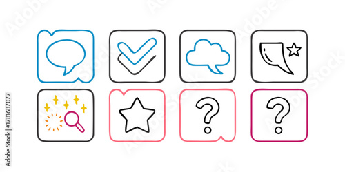 doodle, symbol, signs, design, element, graphic, art, set, collection, line, outline, shape, drawing, vignetting, hand, drawn, style, concept, mark, question, nubes, star, speech, bubble, cloud, frame, square, message, communication, love