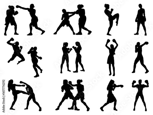 Set of Female Boxing Silhouette in various poses isolated on white background