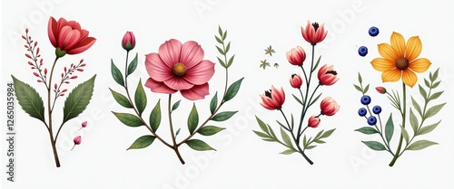 watercolor, floral, flower, bloom, blossom, plant, botanical, nature, spring, summer, red, pink, yellow, green, blue, leaf, stem, berry, illustration, graphic, element, design, decoration, isolated, white background, garden, organic, natural, art, painting, hand-drawn, delicate, elegant, set, collection, website, banner, marketing, presentation