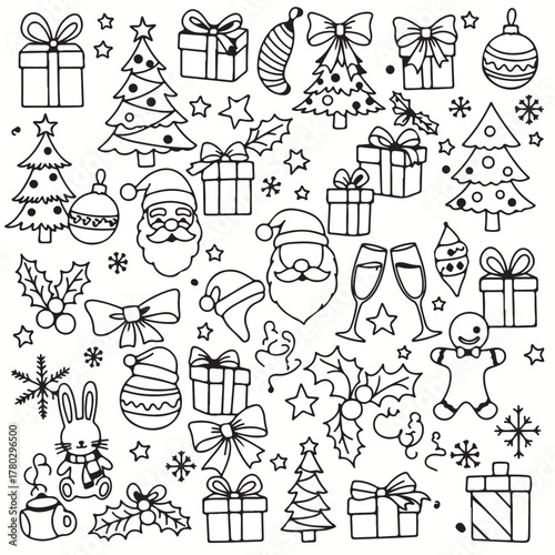 Set of hand drawn Christmas doodles featuring simple holiday icons. Includes Christmas tree, Santa Claus, gifts, bows, stars, ornaments, cocktails, and snowflakes.
