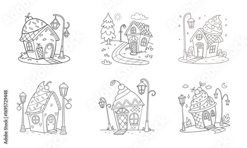 set of hand drawn cute cartoon style ice cream and cupcake houses illustrations for kids coloring book