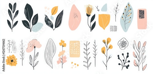 Set of hand-drawn floral frame line art, simple geometric shapes outline drawing clipart collection with wedding elements. floral elements, leaves, and flowers