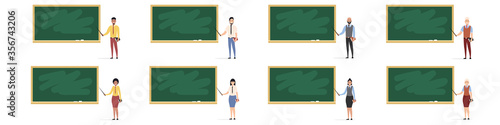 Set of happy teachers near the blackboard. Teaching at an educational institution. Flat style. Vector illustration