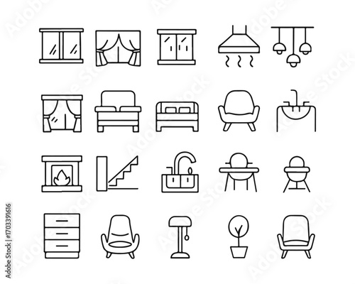Set of line icons related to home furniture, appliance, decoration. Editable stroke. Outline icon collection