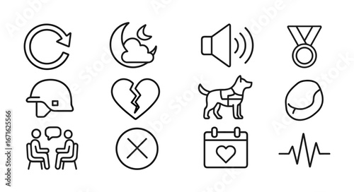 symbol, weather, sound, medal, safety, linear, nubes, therapy, calendar, pulse, icon, communication, dog, assistance, moon, cloud, refresh, broken, meeting, helmet, conversation, protection, heartbeat, reusing, support, emotion, event, appointment, audio, volume, achievement, recognition, design, outline, pictogram, graphic, modern, simple, minimal, interface