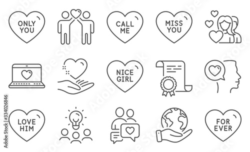 Set of Love icons, such as Miss you, Love him. Diploma, ideas, save planet. Web love, For ever, Only you. Nice girl, Call me, Friends couple. Romantic talk, Hold heart, Couple. Vector