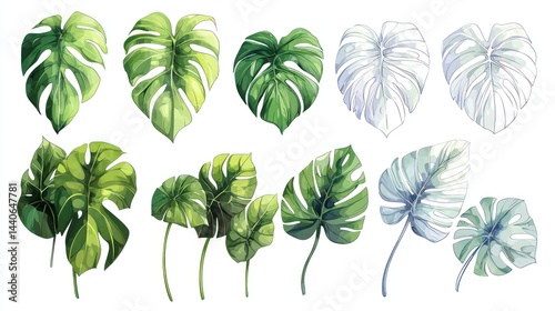 Set of monstera leaves with varying green hues on white background