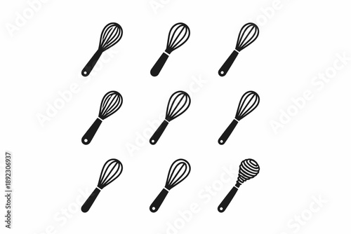 Set of nine black whisk icons in various designs on white background