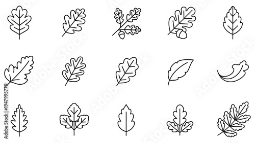 Set of oak leaf icons, various shapes and styles, line art, featuring acorns on some designs