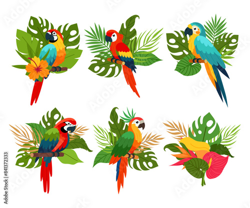 Set of parrots with tropical plants in flat style. Tropical composition. Tropical bird. Jungle plants.