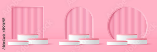 Set of podium for product display presentation. Podium platform to show product with pink circle, square background