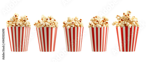 Set of Popcorn in Five Different Poses Against Transparent Background for Snack Branding, Movie Night Promotions, or Culinary Projects