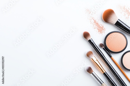 Set of professional makeup brushes and products on a clean background for beauty and cosmetics themes.