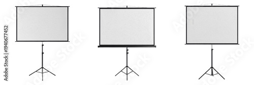 Set of projector screens collection isolated on transparent background white portable tripod projection screen png