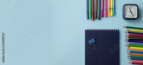 topview, education, children, alarm, back to school, background, blank, blue, bright, clock, colourful, concept, copy space, wax crayons, elementary, empty, equipment, felt-tip pen, notebook, geometry, handwriting, memo, message, minimal, minimalist, many-coloured, note, object, office, paper, pattern, pen, permanent, personal, school, study, supply, tool, work, workplace, write, student