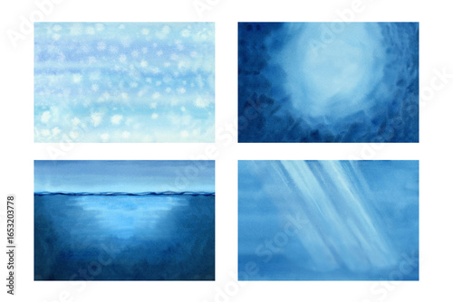 Set of seascapes of calm blue sea with waves, underwater part, blue soft sky. Watercolor background template for use in calming posters, meditation apps, invitations, screensavers, ocean decor