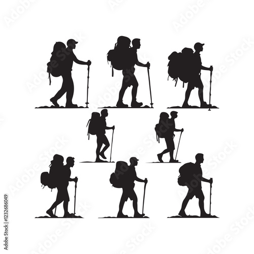 Set of silhouette of Hiking man. hikers with rucksacks and backpack silhouette.