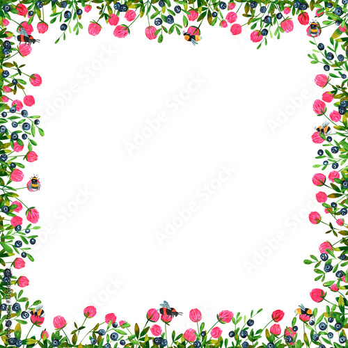 Set of square frames made of watercolor clover flowers and blueberries. Clip art, design element.