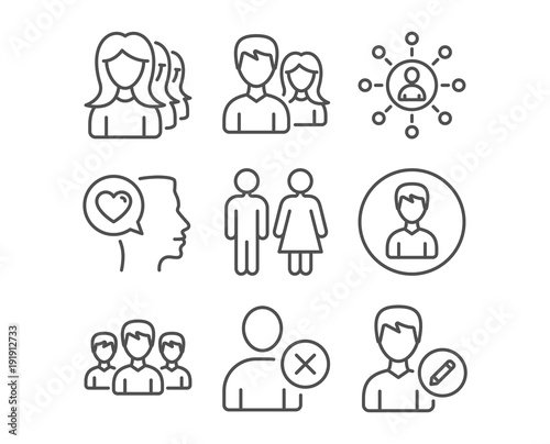 Set of Teamwork, Restroom and Group icons. Women headhunting, Delete user and Person signs. Networking, Romantic talk and Edit person symbols. Man with woman, Wc toilet, Group of people. Vector